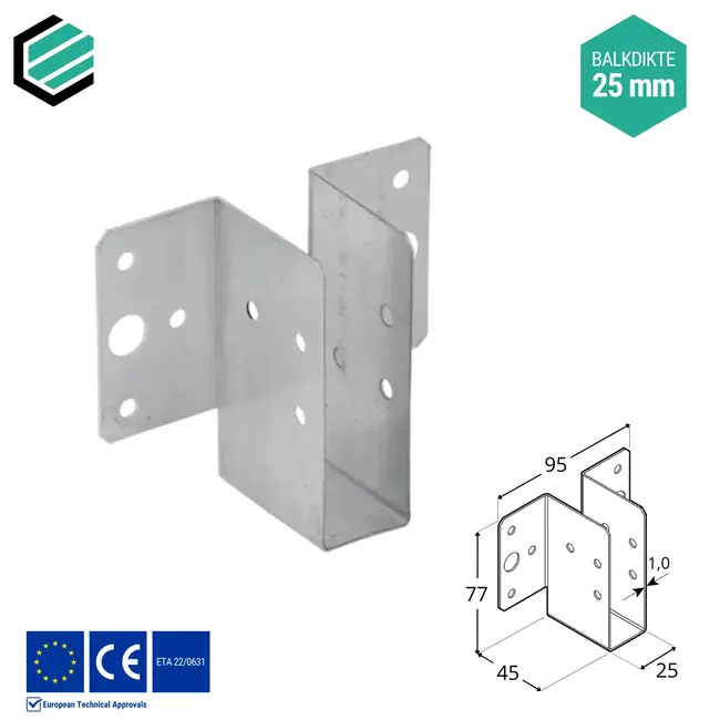 Regeldragers nodig voor een ijzersterke verbinding van uw lichte hout- en of hout-betonverbinding? Wij hebben deze in verschillende afmetingen waaronder deze van 25x77x45 mm en een dikte van 1,0 mm.